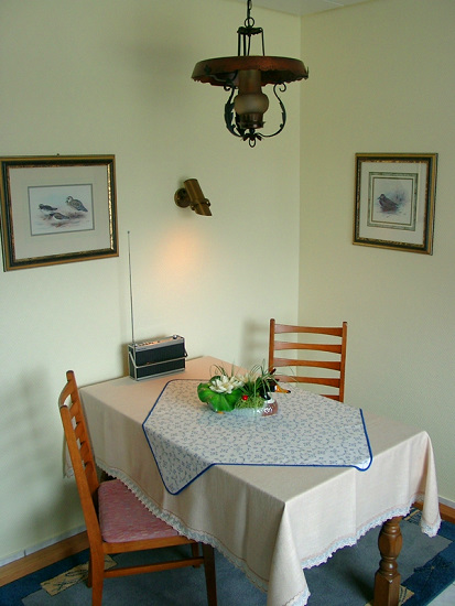 Das gemütliche Wohnzimmer mit Schlafsofa (evtl. 3 Personen) hat SAT-TV und Radio. Alle Fenster sind isolierverglast und mit Rollläden - zum Teil elektrisch - versehen.