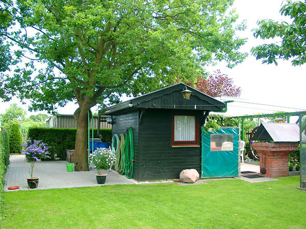 In unserem Garten bieten wir Ihnen eine Liegewiese und ein Gartenhaus mit überdachter Terrasse und gemauertem Grill für gemütliche Grillabende.